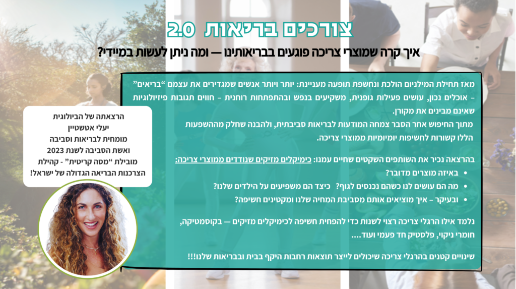 ההרצאה מיועדת לקהל רחב בגילאי 18–80 ומדברת בגובה העיניים על הקשר בין צריכה יומיומית לבריאות שלנו.